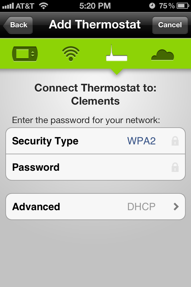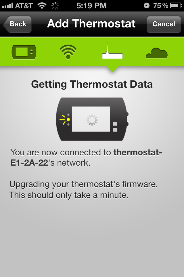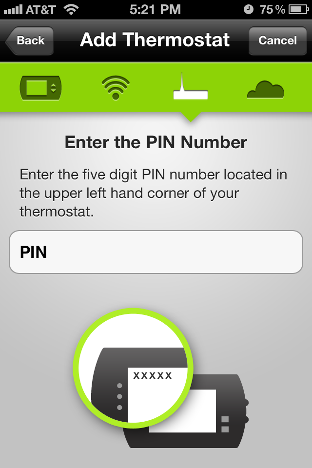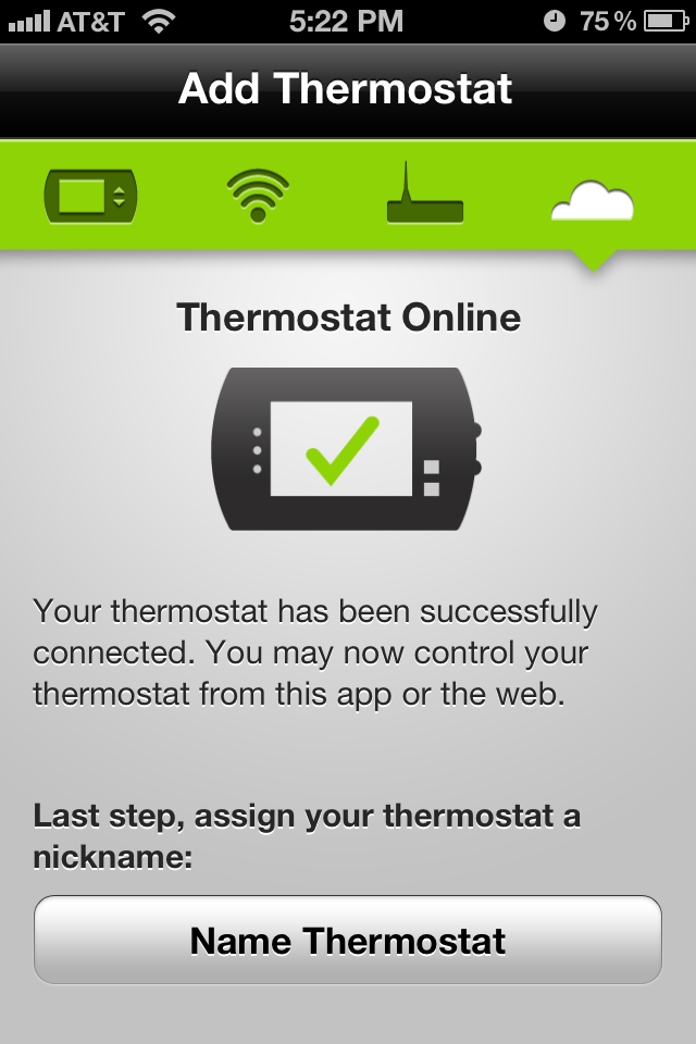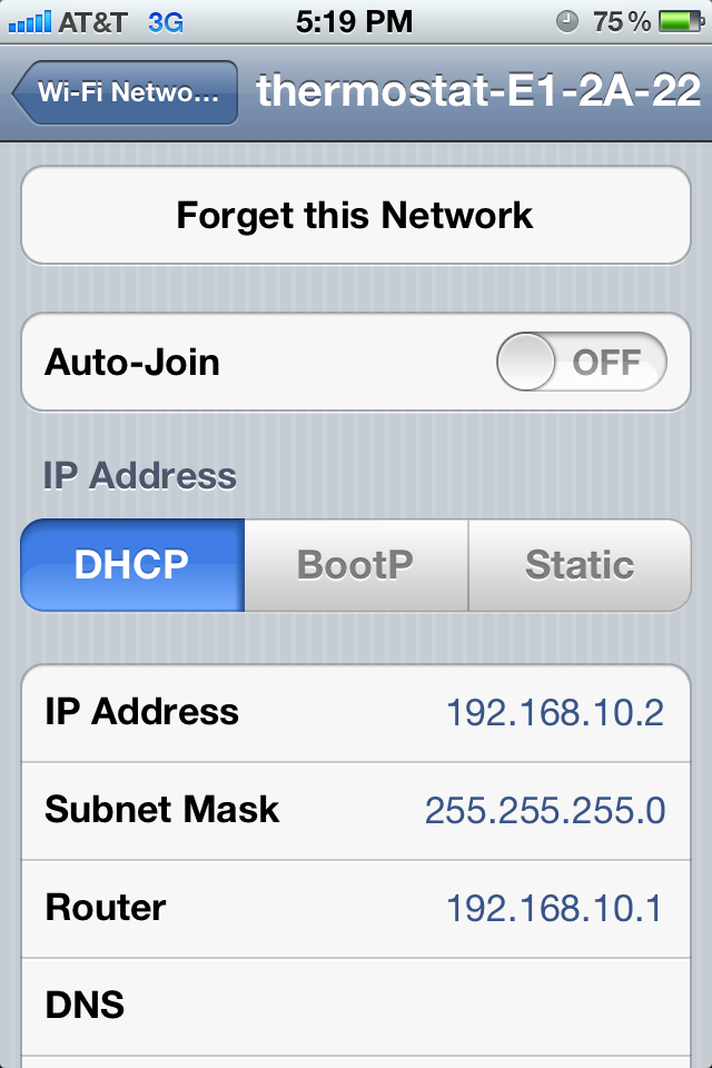 The easiest way to describe the wireless setup is that the radio comes preconfigured with it’s own SSID to attach to, it’s own DHCP server, and a PIN based authentication that is displayed on your thermostat screen. Goto the Radio Thermostat site and create yourself a user account. If you have an iPhone, download the free app from the App Store. The app prompts you to log using your Radio Thermostat credentials, then prompts you to join the SSID hosted by the thermostat (wow, there’s something I never thought I’d type!). You then switch back to the Application, configure the unit to connect to your home wireless (SSID and encryption keys), then enter the PIN displayed on the thermostat to complete the setup.