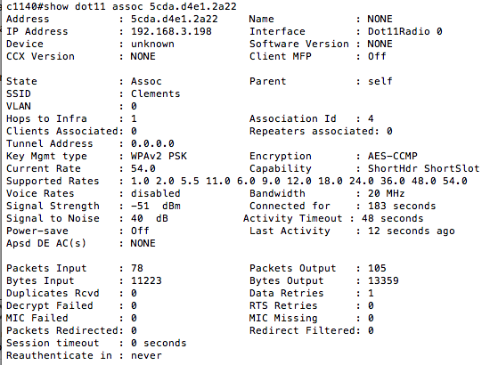 In all, the installation was fairly painless and intriguing overall. Those of you interested in the wireless capabilities of the unit, it is a 2.4GHz radio that supports 802.11b/g data rates, open SSIDs, WEP, or WPA2 security. Here is what my unit looks like from a Cisco AP: