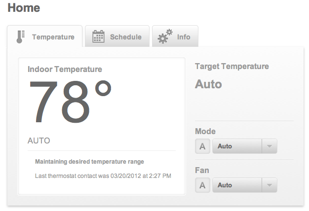 Once your thermostat is online it does all of the cool things you’d expect it to – it auto updates it’s firmware, sets the time based on NTP and your timezone and then allows you to log into the Radio Thermostat page to create your heating and cooling schedules as well as perform instant changes such as setting away from home, turning on cool/heat, turning on or off the fan, etc.
