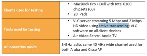(this is the continuation you were looking for) The reason I suggest a Miercom report instead of publishing ‘internal Aruha test results’ is that Arubas tests seem fraught with inconsistencies and, in my book, this calls into question the validity of their test process and results. Put another way, how can we be sure your data is accurate if you’re testing iPads without listing them as clients and pulling shady transcoding shenanigans, calling it the same as full-resolution media streams. Is that an extreme opinion? Perhaps, but independent reporting should clean up those rough edges and level the playing field.