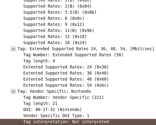 Yes – that is a Probe Request that is asking for the SSID “Nintendo_3DS_continuous_scan_000”. This is particularly interesting since a) I hadn’t powered on my Nintendo 3DS in about 3 months (thank you CCNP) until last night and b) when I was done playing with it, I just closed the lid thinking it would just go quietly off into standby. Clearly that wasn’t the case so I hunted around for where I dropped it last and opened the lid. To my surprise, the Probe Requests stopped! Closed the lid and in about 10 seconds, they started again! Clearly something is going on here so I dug a little further… Inspecting the Probe Request reveals some interesting tidbits – down towards the bottom is “Vendor Specific: Nintendo”: