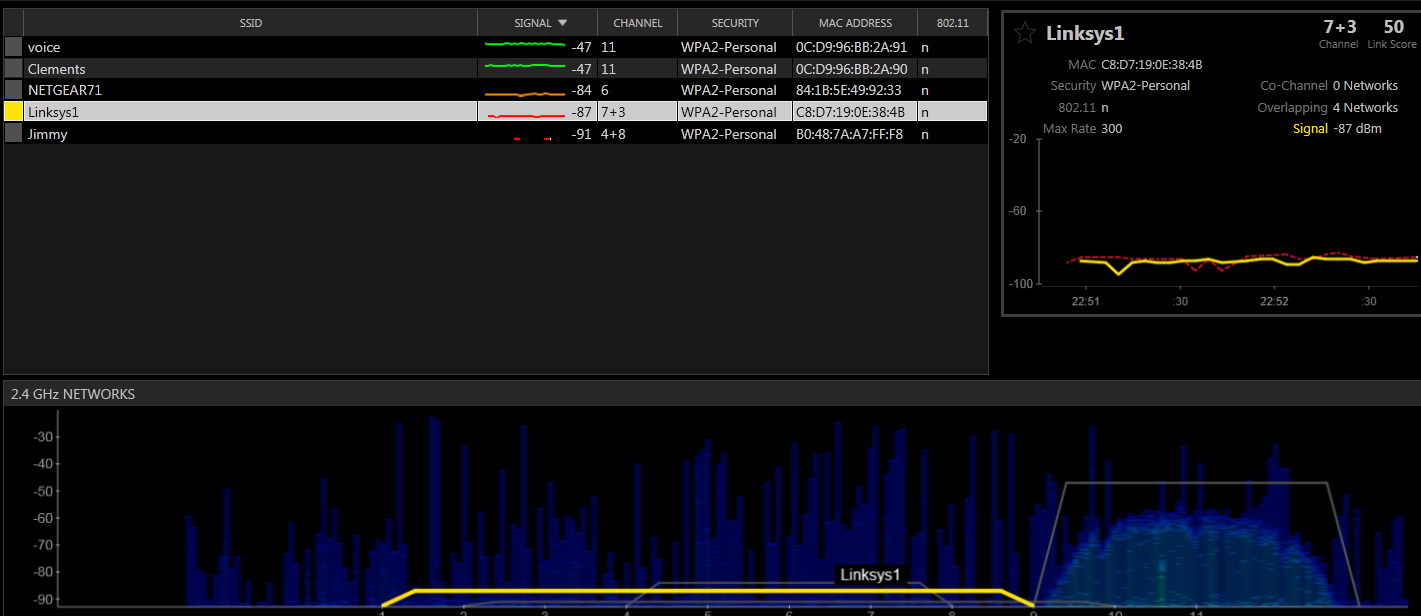 Once you’ve launched the application, the Networks tab gives you a wealth of information including a spectral mask view in the bottom of the page as well as a list of SSIDs in range of your adapter.