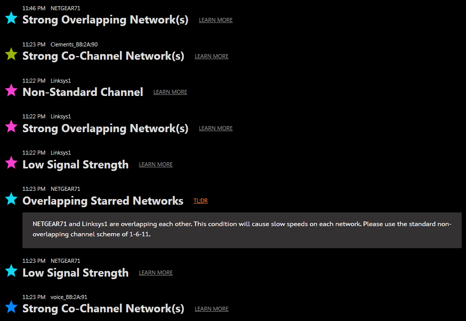 Following through the top tabs into Networks, Channels, and Analyze basically walks even the most novice user logically through visually displaying what they have in the air around them, what’s free/used, and gives you a really strong understanding about what’s going on in the non-802.11 world without needing a degree in understanding RF.