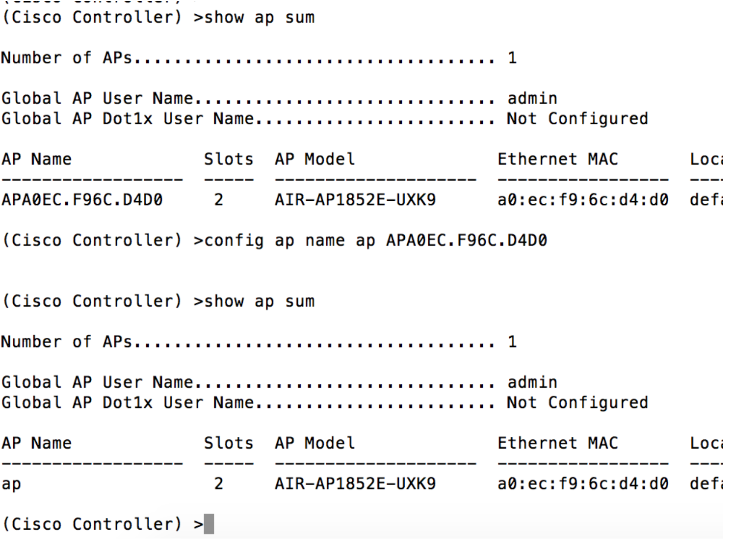 Some of the defaults are not completely friendly. We’ll clean those up now. Discover the name of the Access Point using ‘show ap summary’ and rename it to something more friendly like ‘ap’. It should be noted that renaming your Access Point to ‘ap’ will make configurations easier and in line with the examples below, but if you’re part of a larger team and require unique Access Point names, this is where you would set them, making note to use your defined Access Point name instead of the shortened name ‘ap’ as described in the rest of this document.