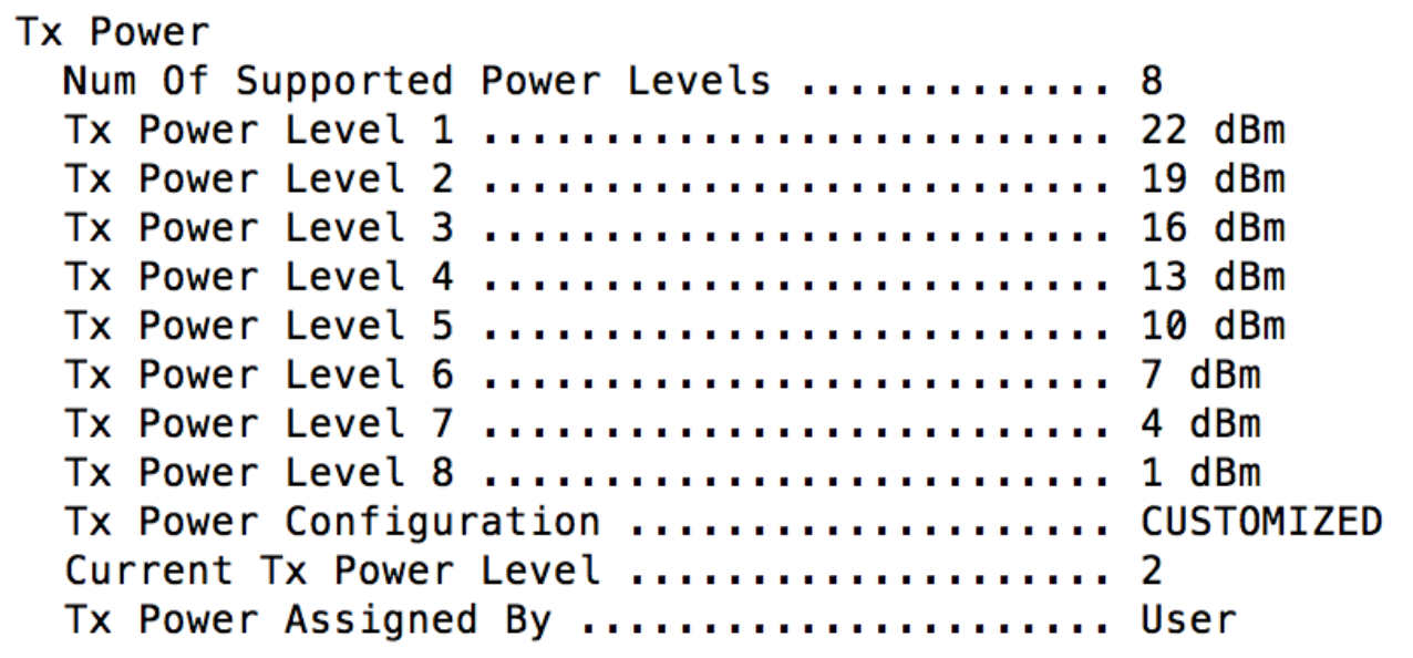 To see the power level of the Access Point currently configured, use the ‘show ap config slot 0 ap’ (for 2.4GHz) or ‘show ap config slot 1 ap’ (for 5GHz’ command and look for the following data: